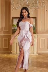 Make a statement with our Blush Satin Off-Shoulder Gown with Bow, designed for the modern woman who values sophistication and grace.