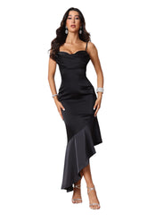 Step into the spotlight with this stunning black silk asymmetrical evening gown, designed for women who appreciate sophistication and timeless elegance. Crafted from luxurious silk, this dress hugs your curves beautifully, exuding both sensuality and grace. The sweetheart neckline highlights your collarbones and neck, ensuring you make a captivating entrance at any event.