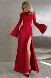 Step into sophistication with this stunning red long sleeve maxi dress, designed for women who want to turn heads at any event. From its flowing silhouette to its daring thigh-high slit, this gown perfectly balances elegance and allure.