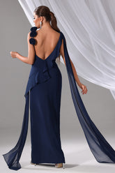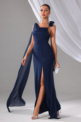 Imagine walking into an upscale party, a wedding reception, or a luxurious evening gala dressed in this exquisite navy one-shoulder evening gown. The elegant fabric flows gracefully with your movements, while the one-shoulder design and floral accents add a modern twist. The open back not only ensures a perfect fit but also adds a hint of allure.
